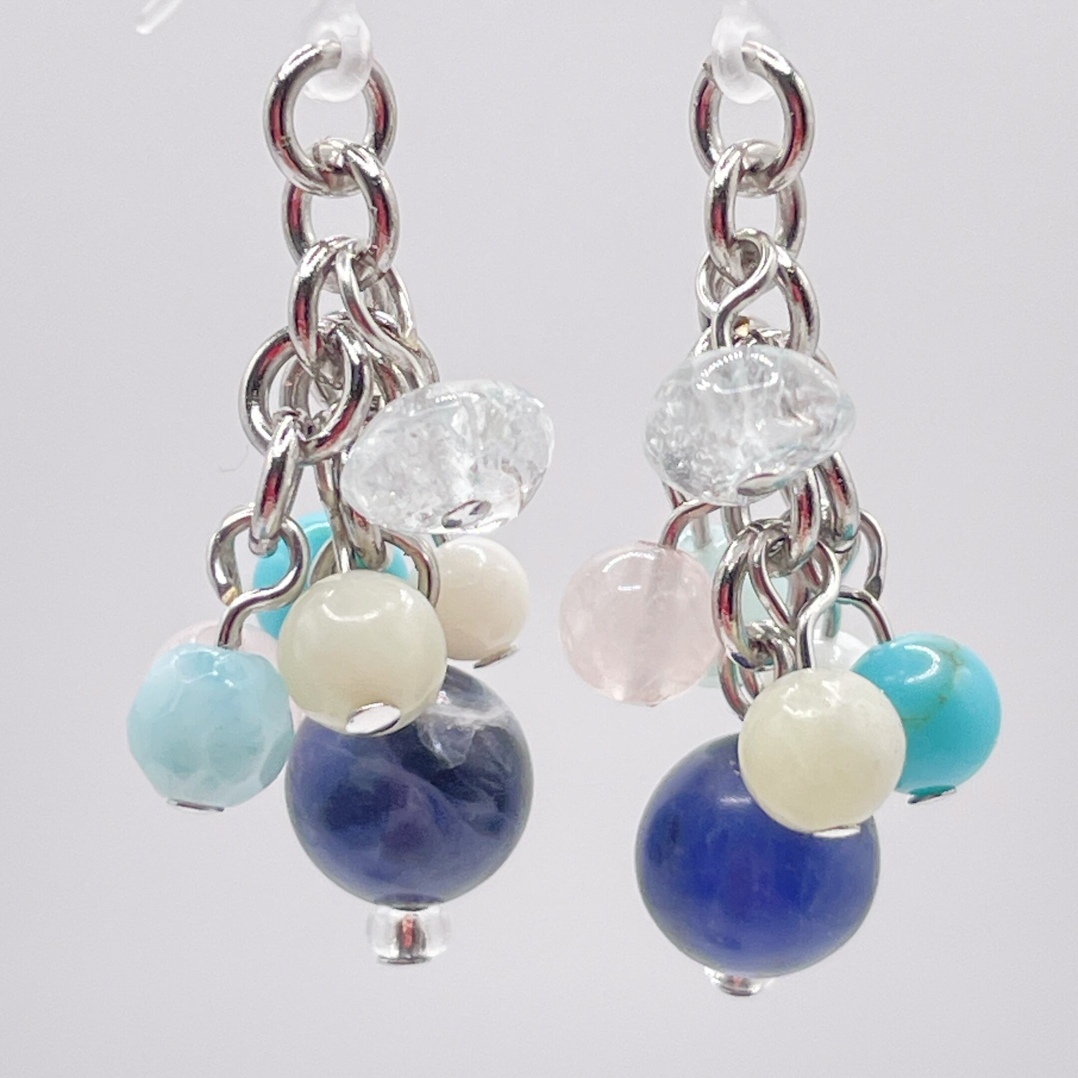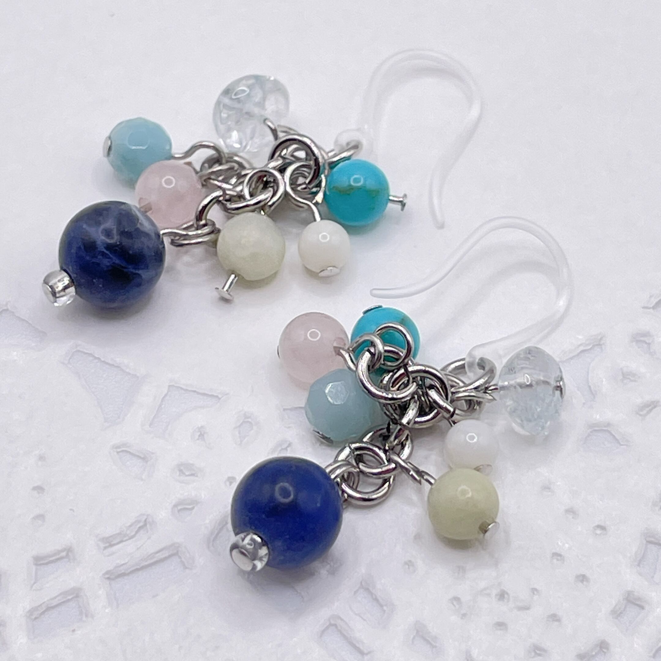 ソーダライトやターコイズなどブルー系の天然石を中心に、澄んだ青空のイメージのピアスに仕上げました。
