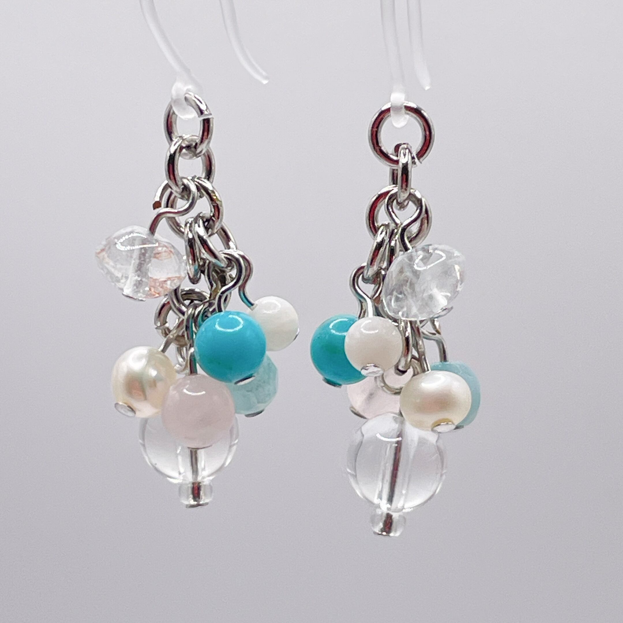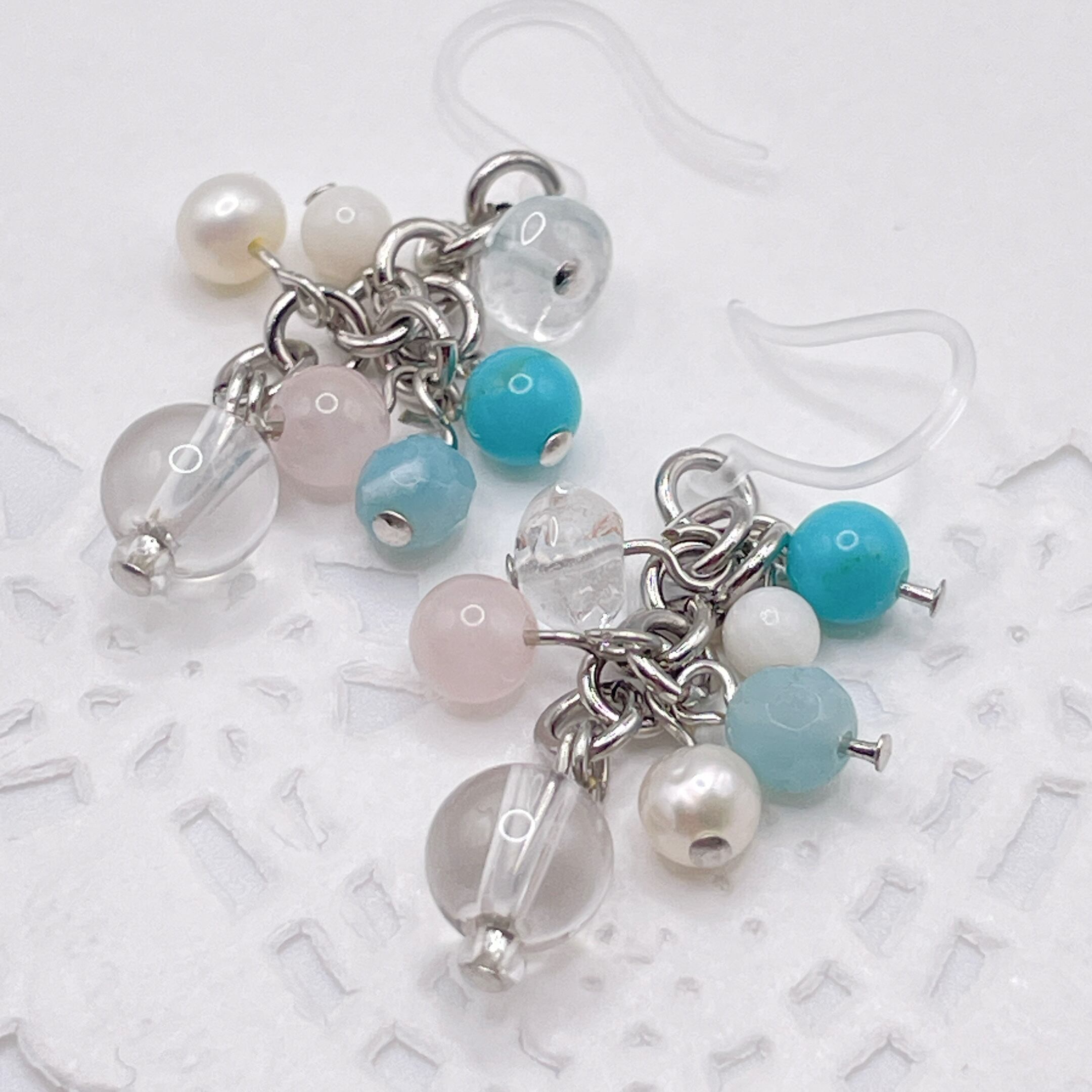 水晶やターコイズ、アマゾナイトなどブルー系の天然石を中心に、澄んだ青空のイメージのピアスに仕上げました。