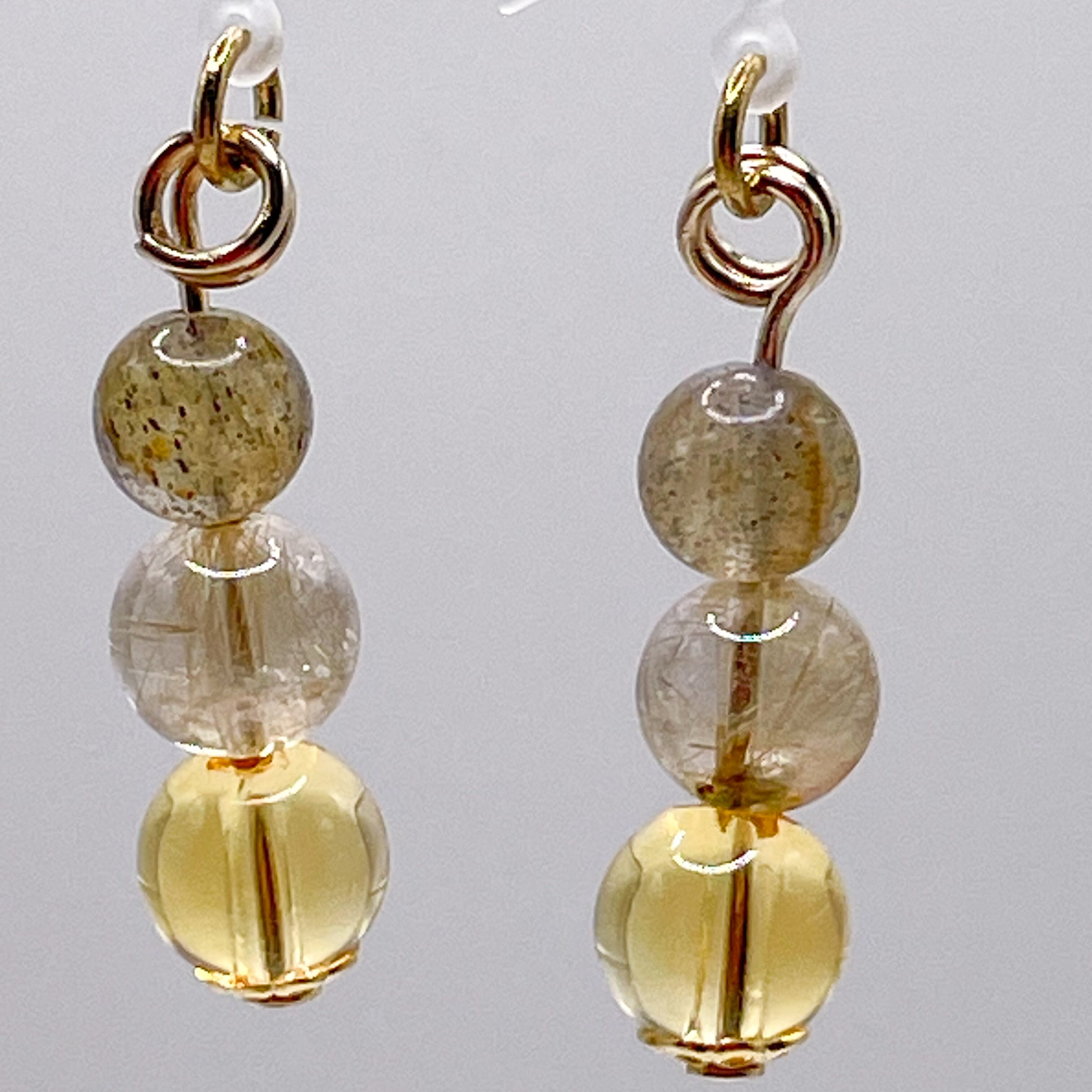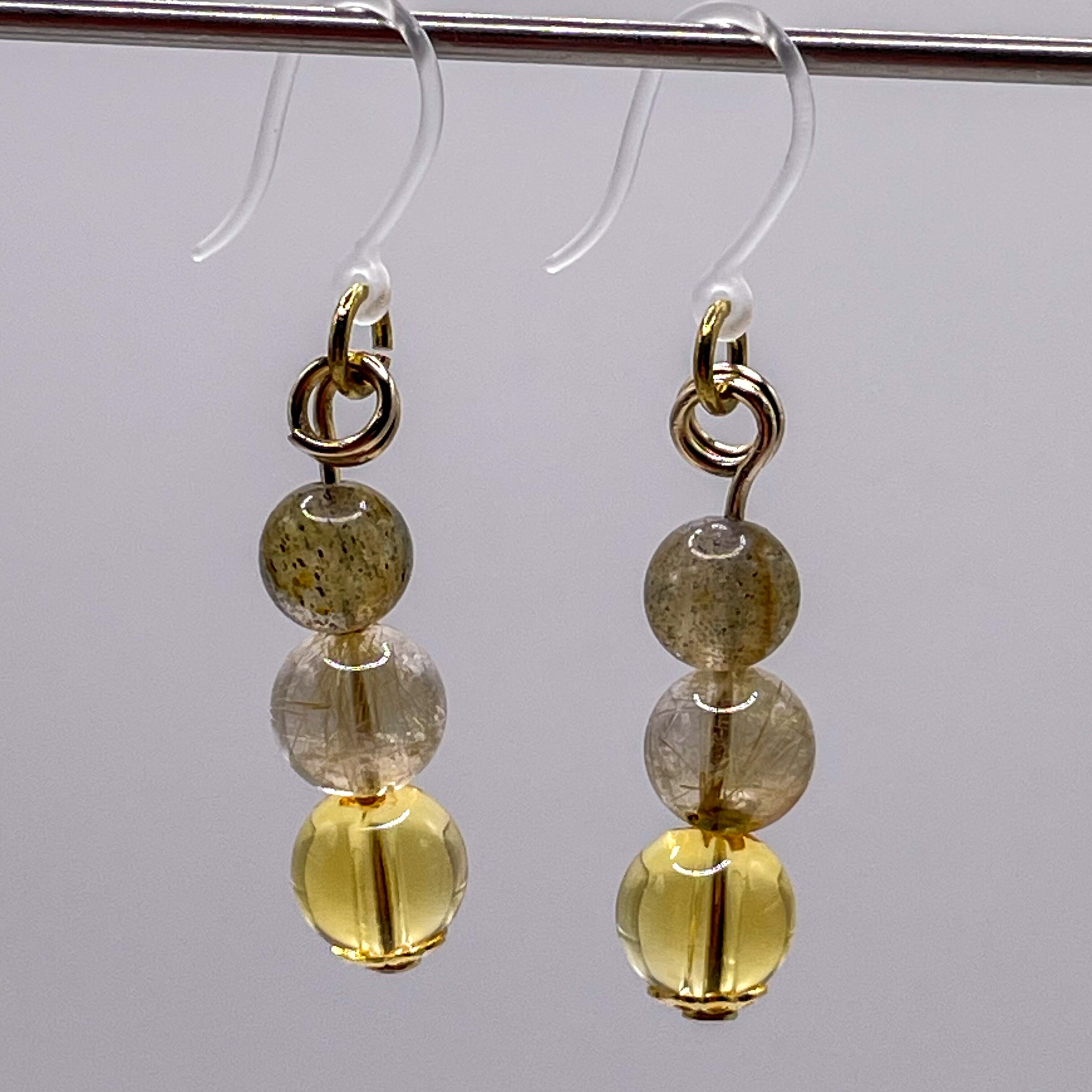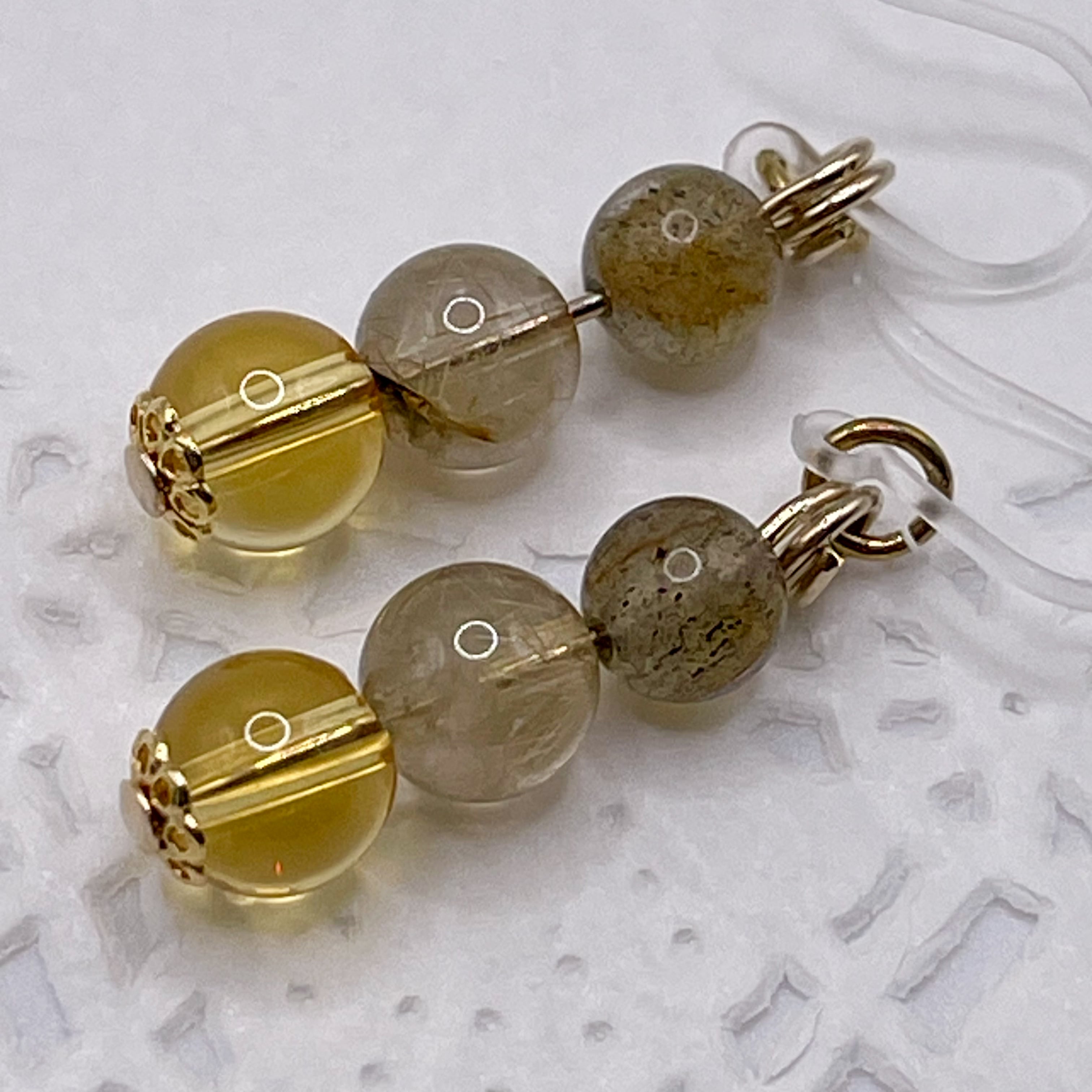 シトリン、ルチルクォーツ、ラブラドライトを使い、お団子のようなデザインに仕上げたピアス(イヤリング/チャーム)です。