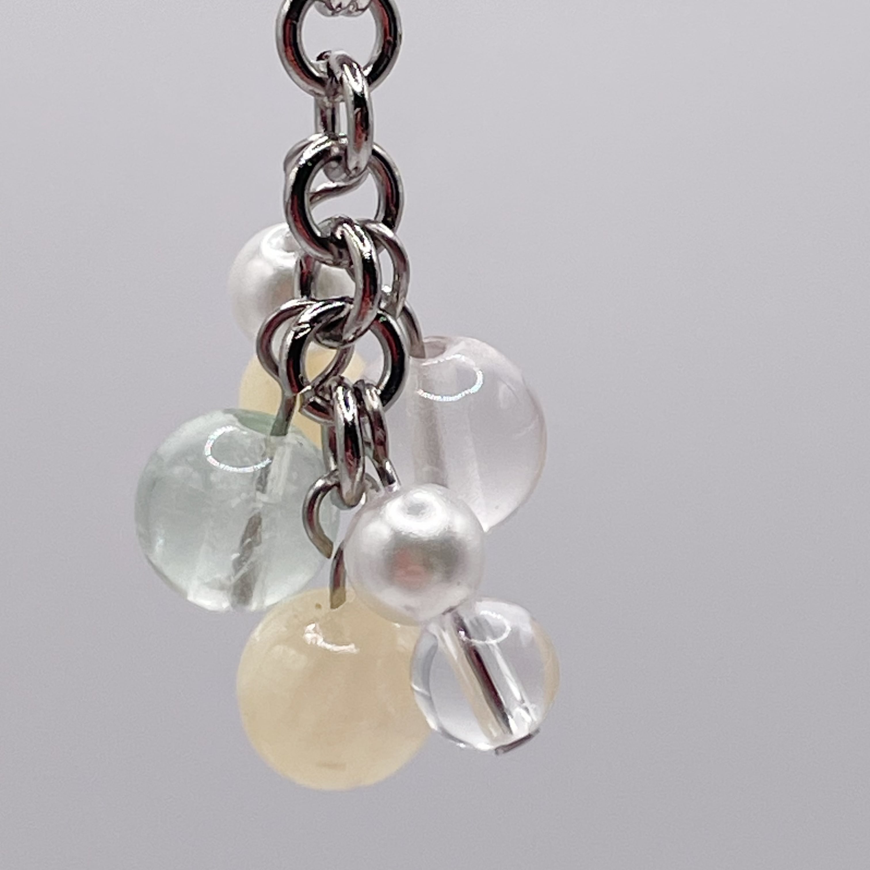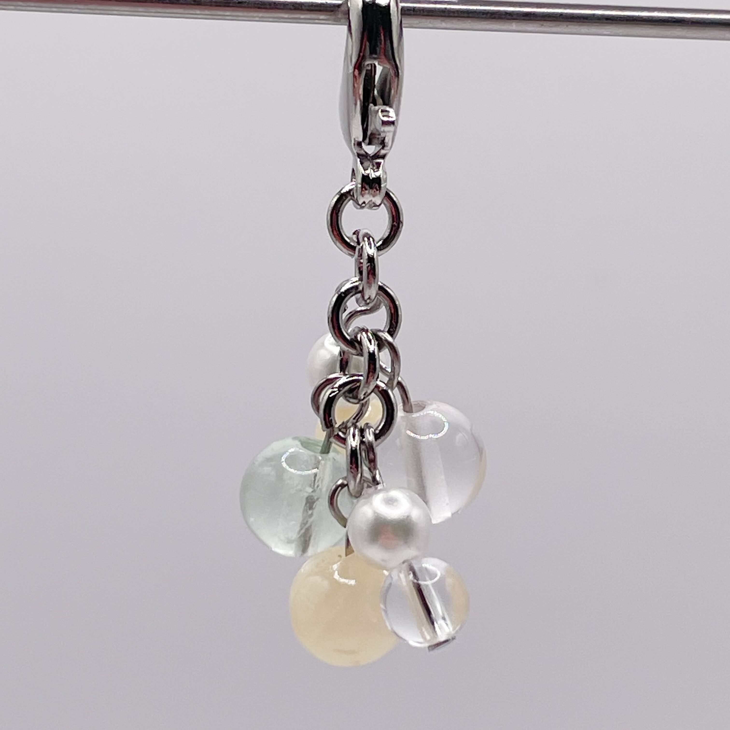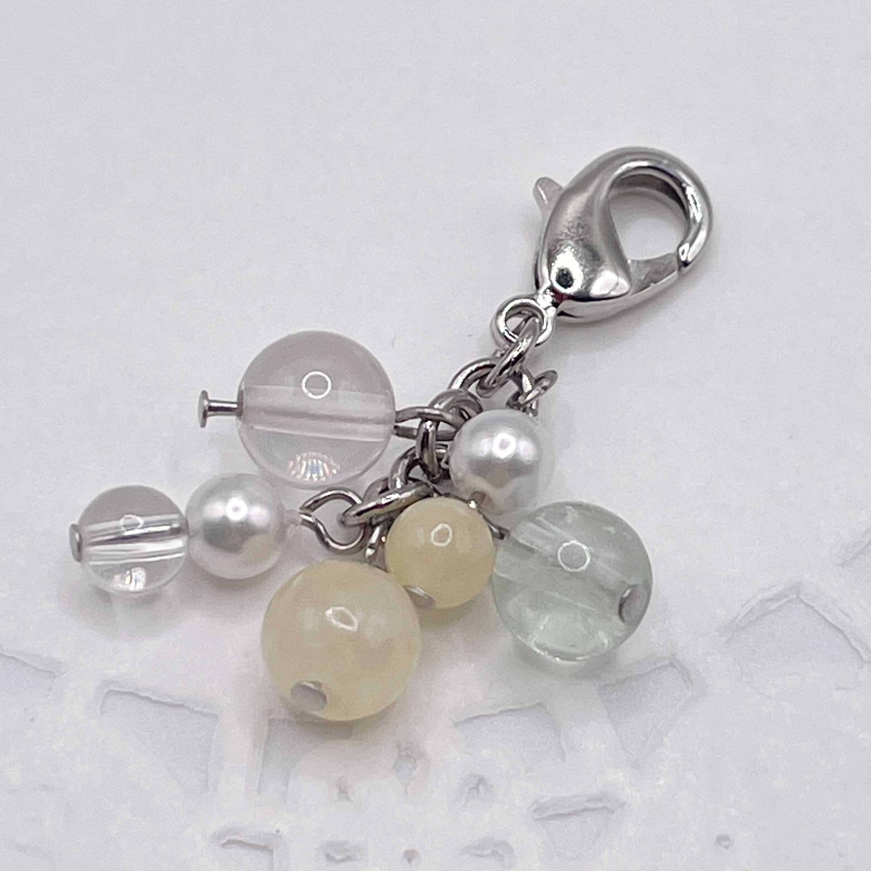 ハニーストーン、トパーズ、グリーン系のフローライトといったパステルカラーの天然石を中心としたチャームです。