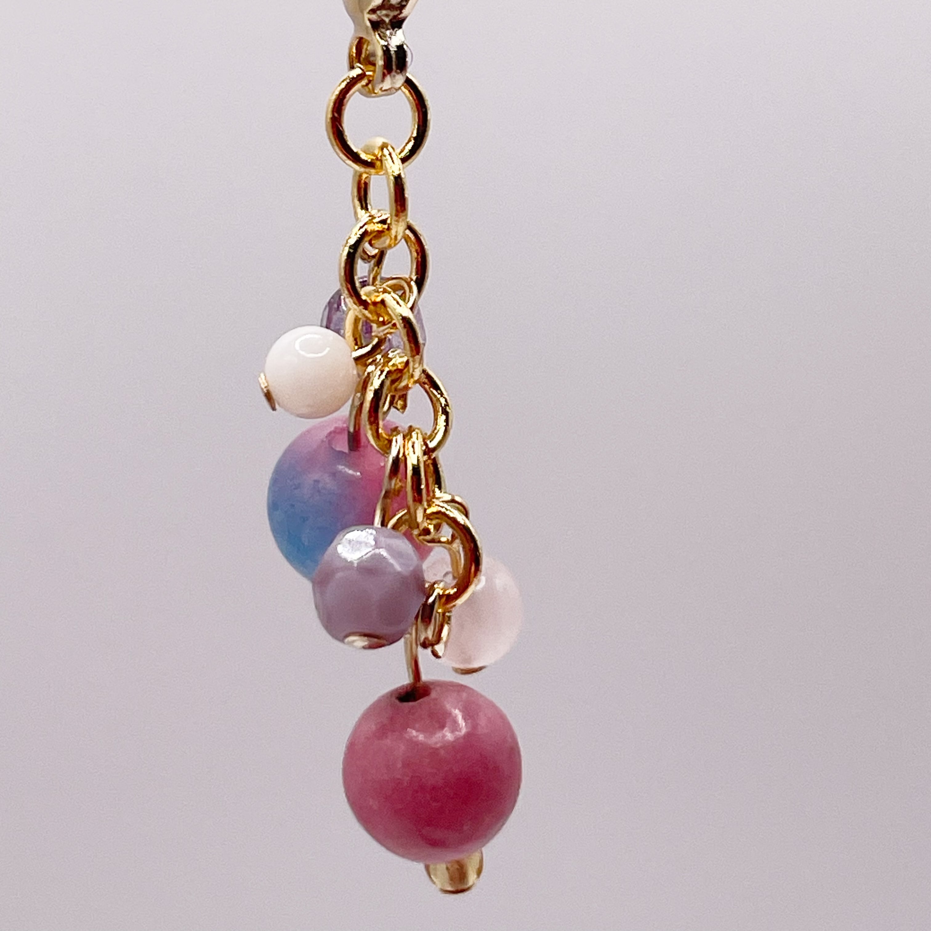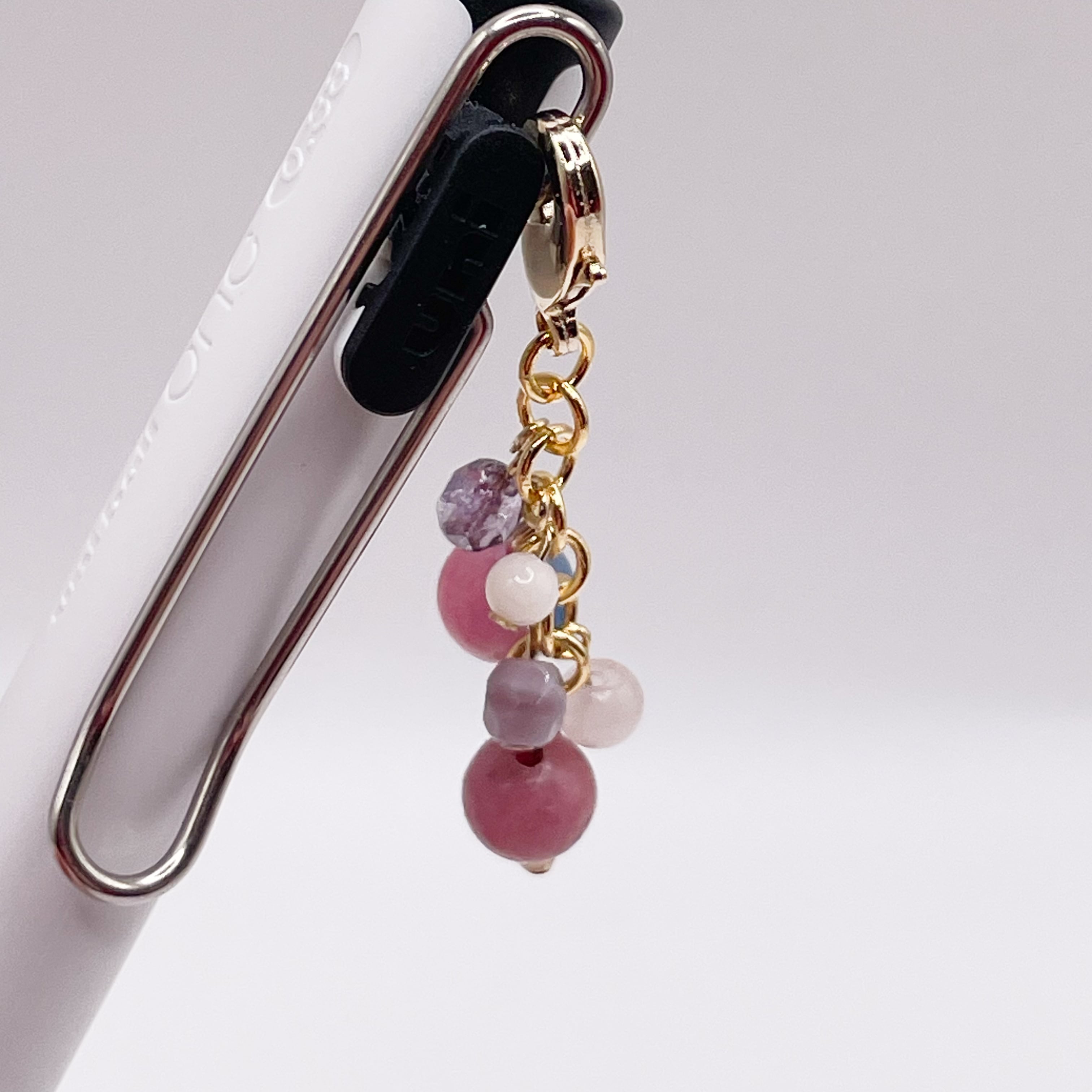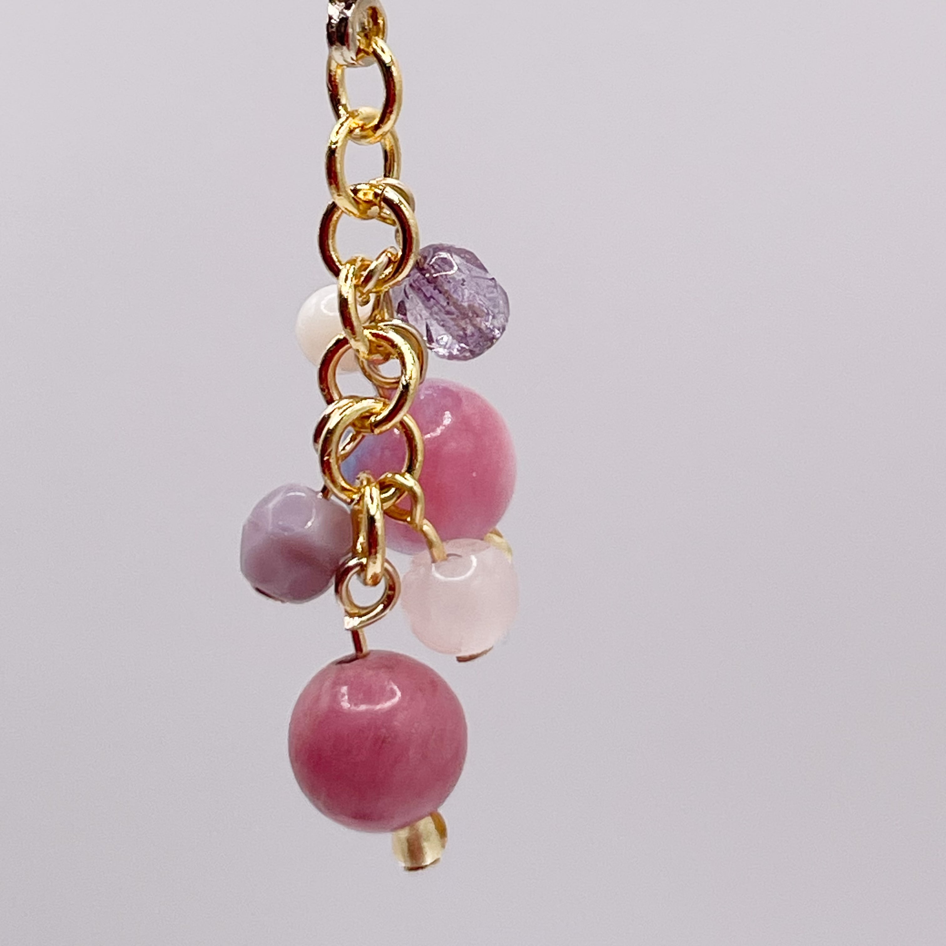 ロードナイトにキャンディジェイド、ローズクォーツといった華やかな色の天然石を合わせたチャームです。