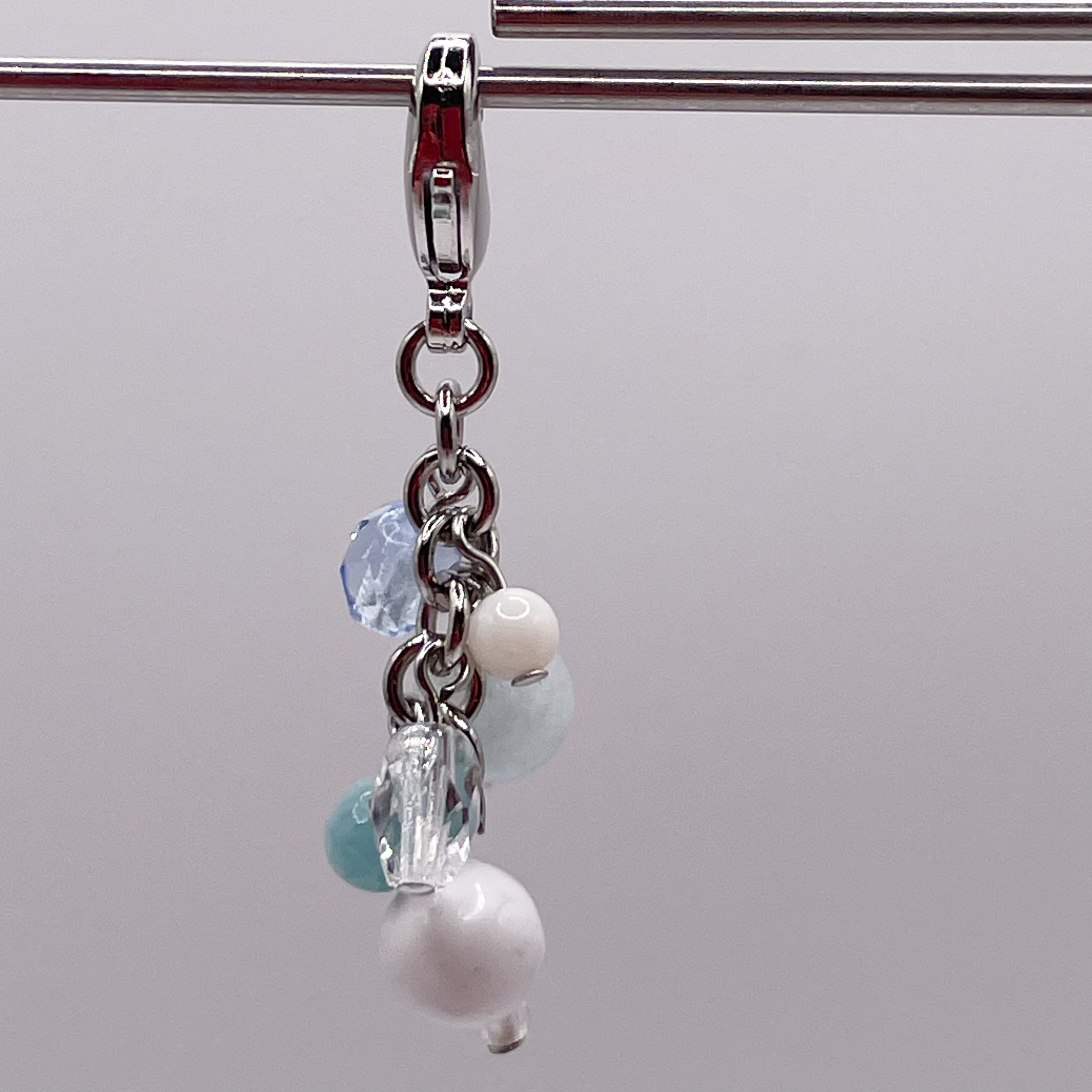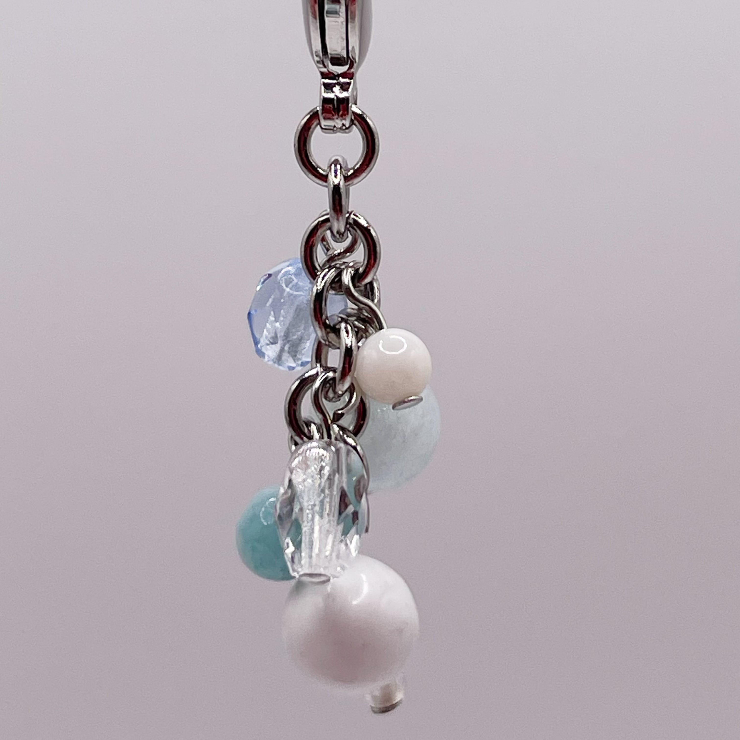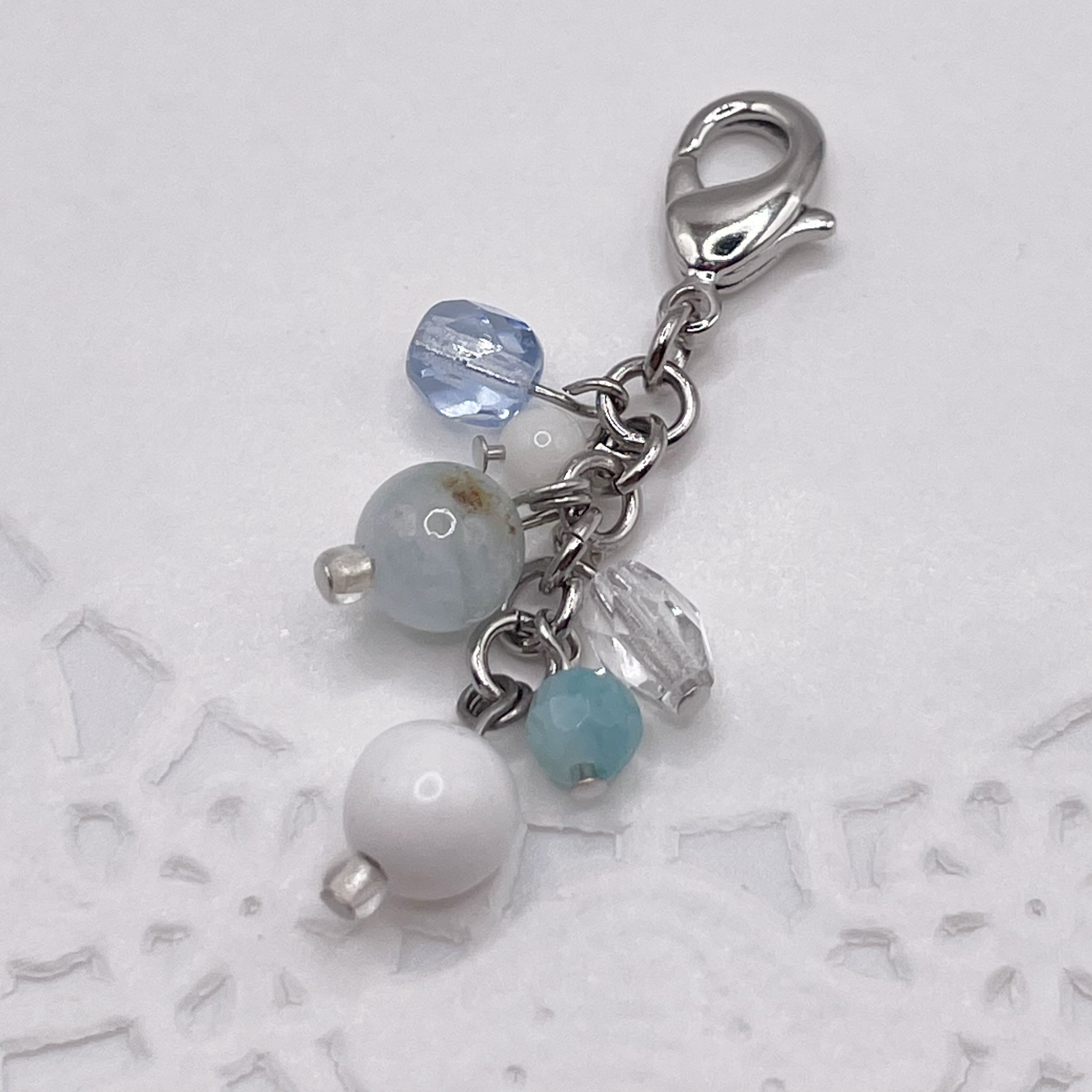 アクアマリンやアマゾナイトといったブルー系の天然石に白いマグネサイトを合わせたチャームです。