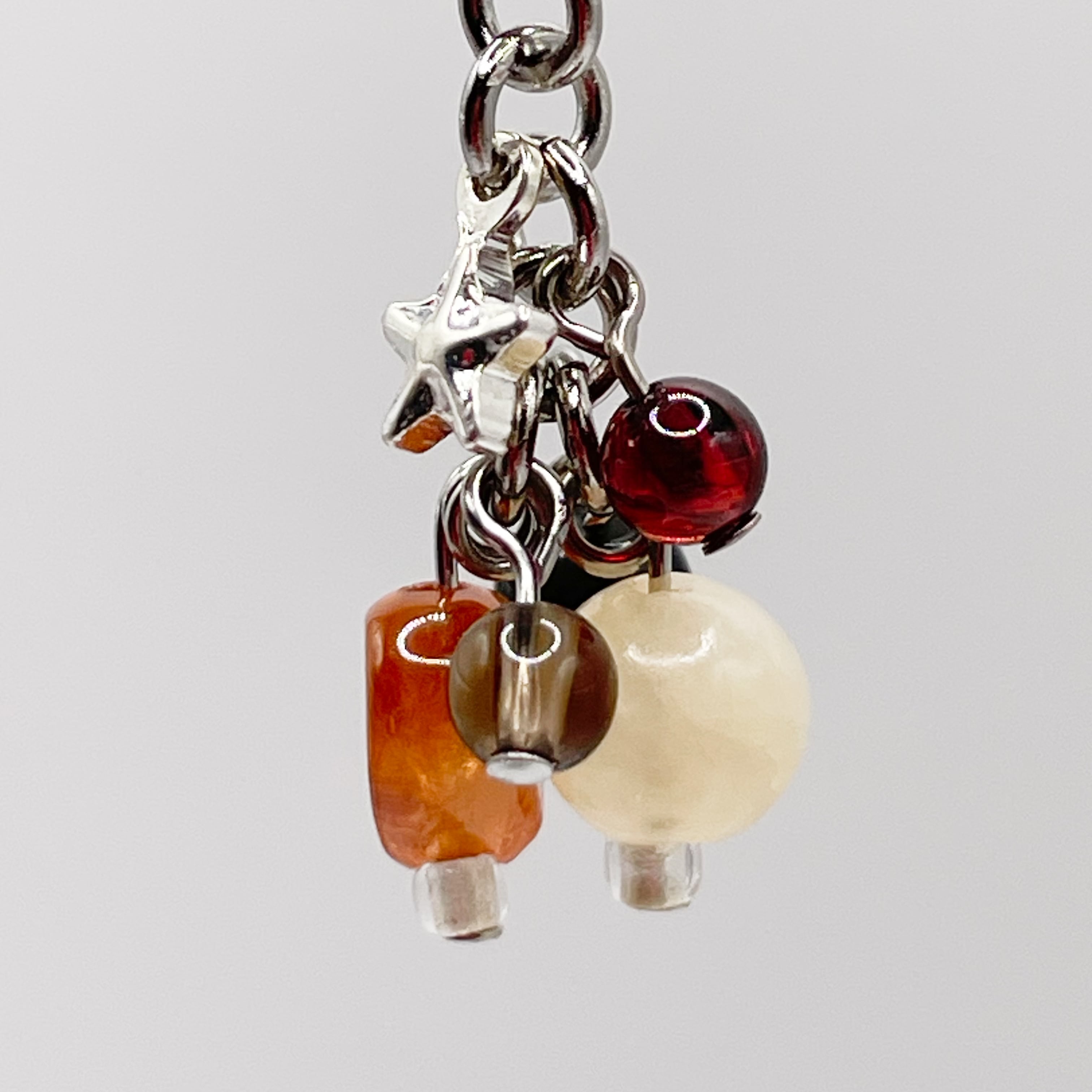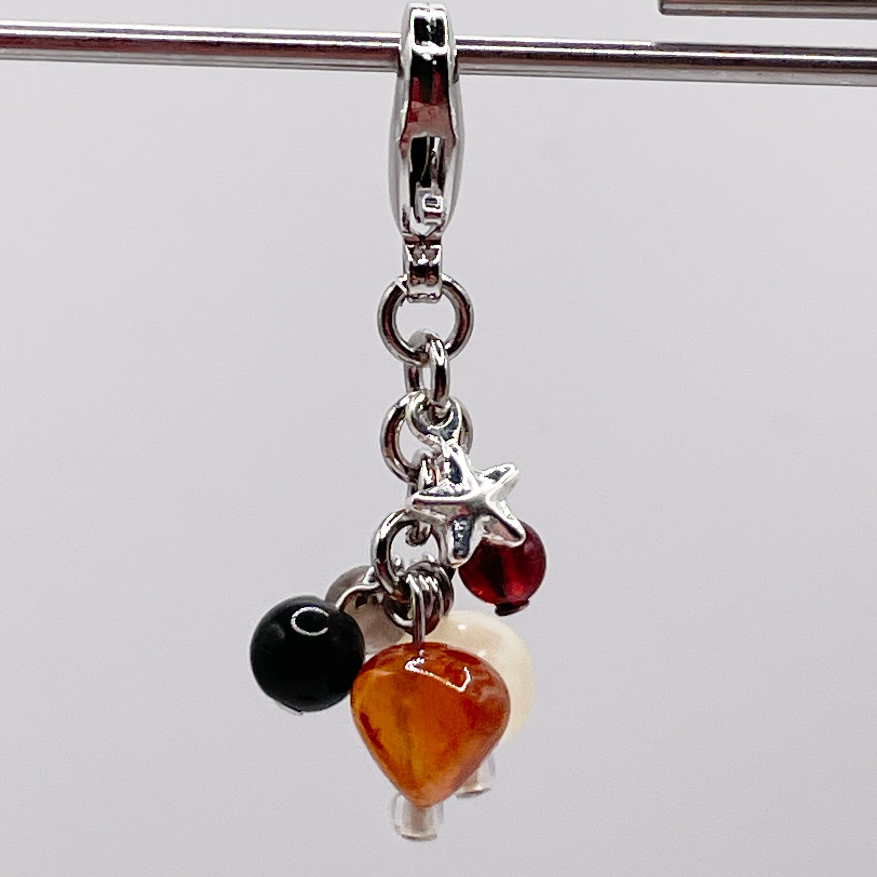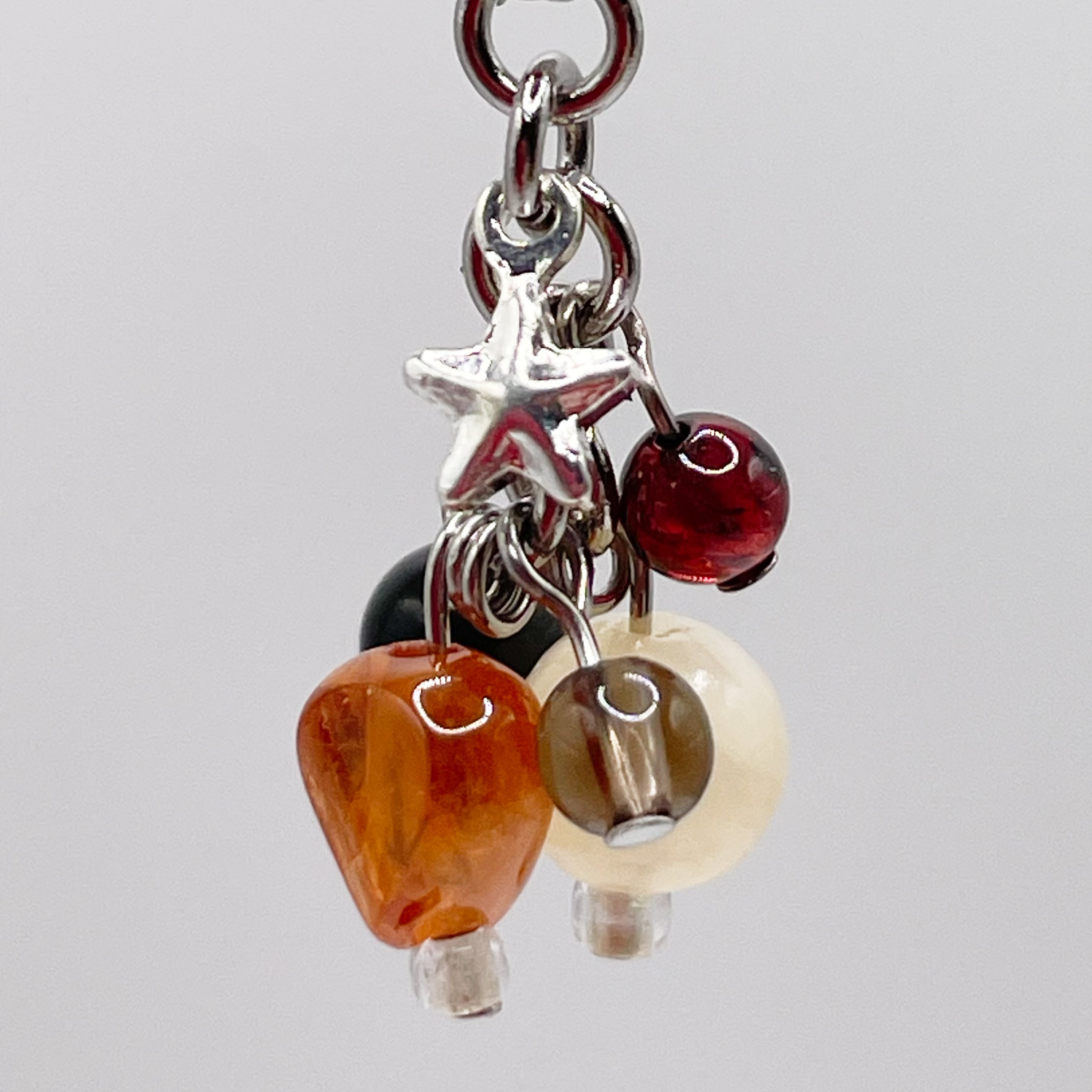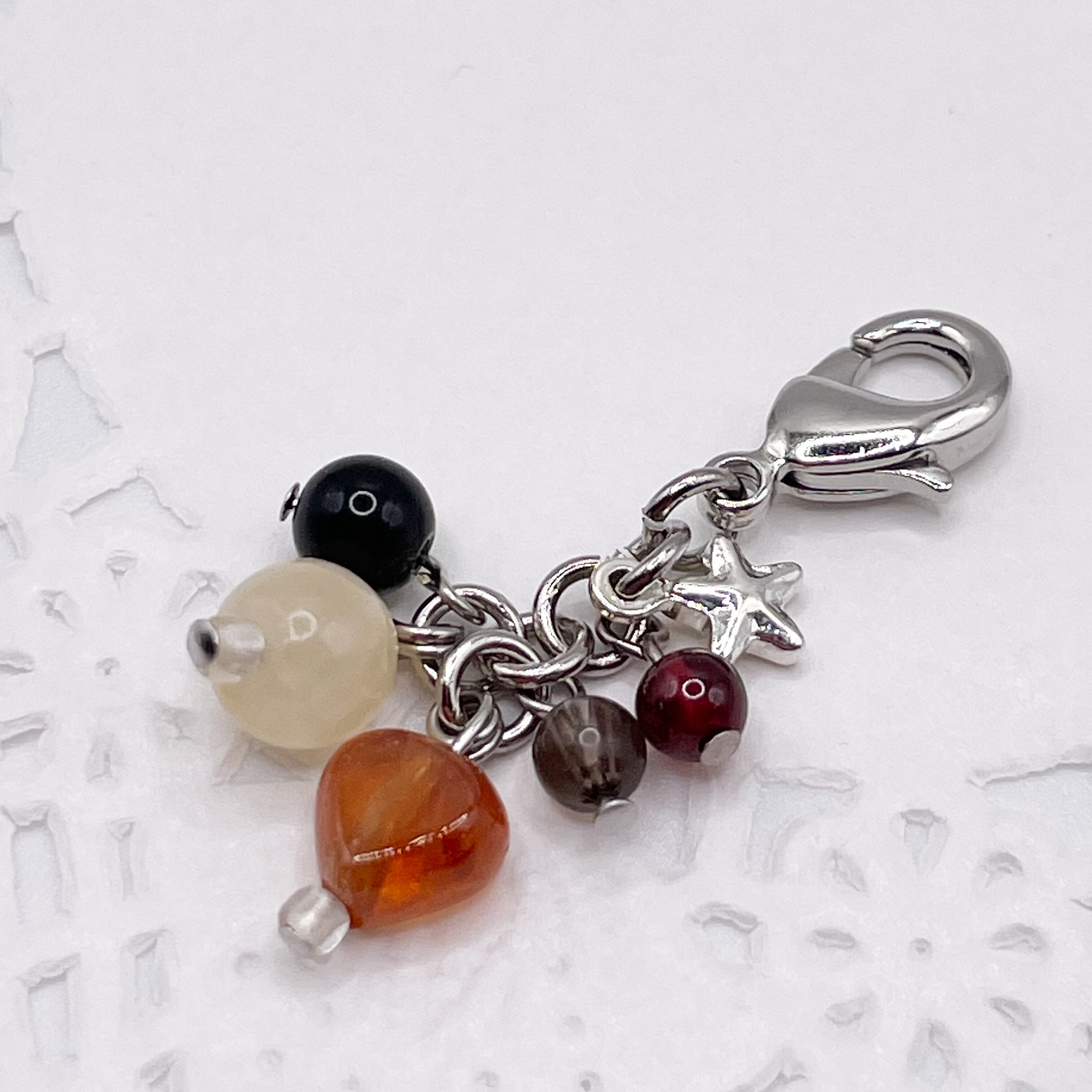 ハニーストーン(アラゴナイト)、オレンジガーネットといった暖色系にオブシディアン(黒曜石)やスモーキークォーツを合わせた天然石チャームです。
