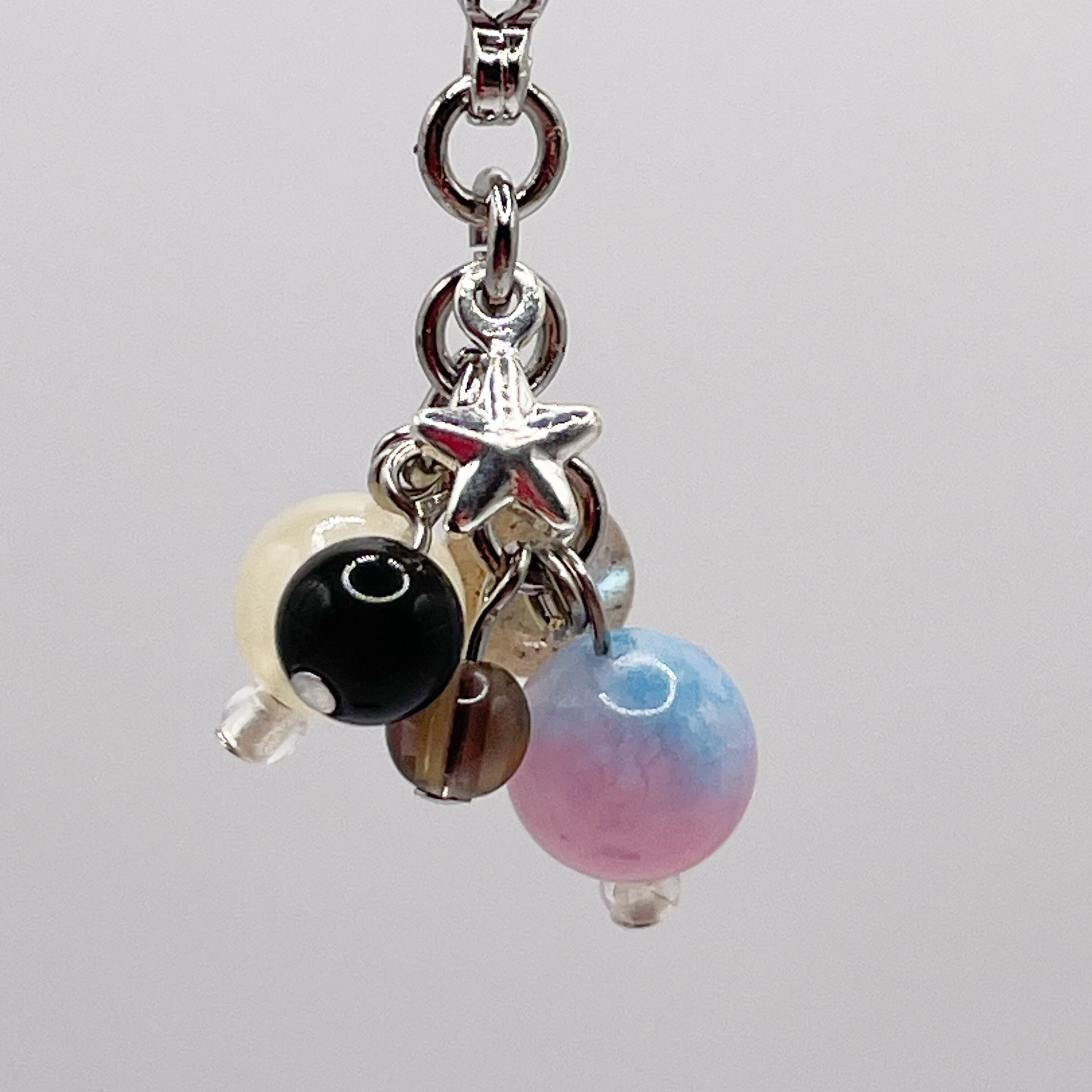 キャンディジェイドにハニーストーン(アラゴナイト)といった明るい色の天然石にラブラドライト、オブシディアン(黒曜石)といったシックな色を合わせた天然石チャームです。