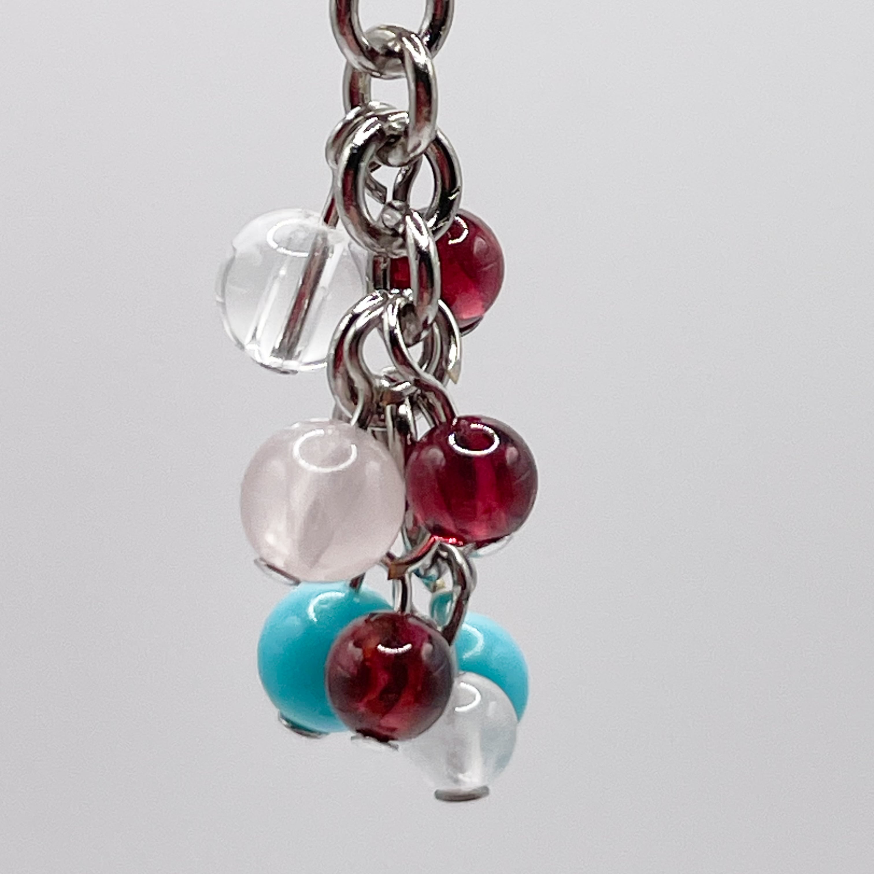 空色のターコイズに深紅のガーネット、淡いピンクのローズクォーツを合わせた天然石チャームです。