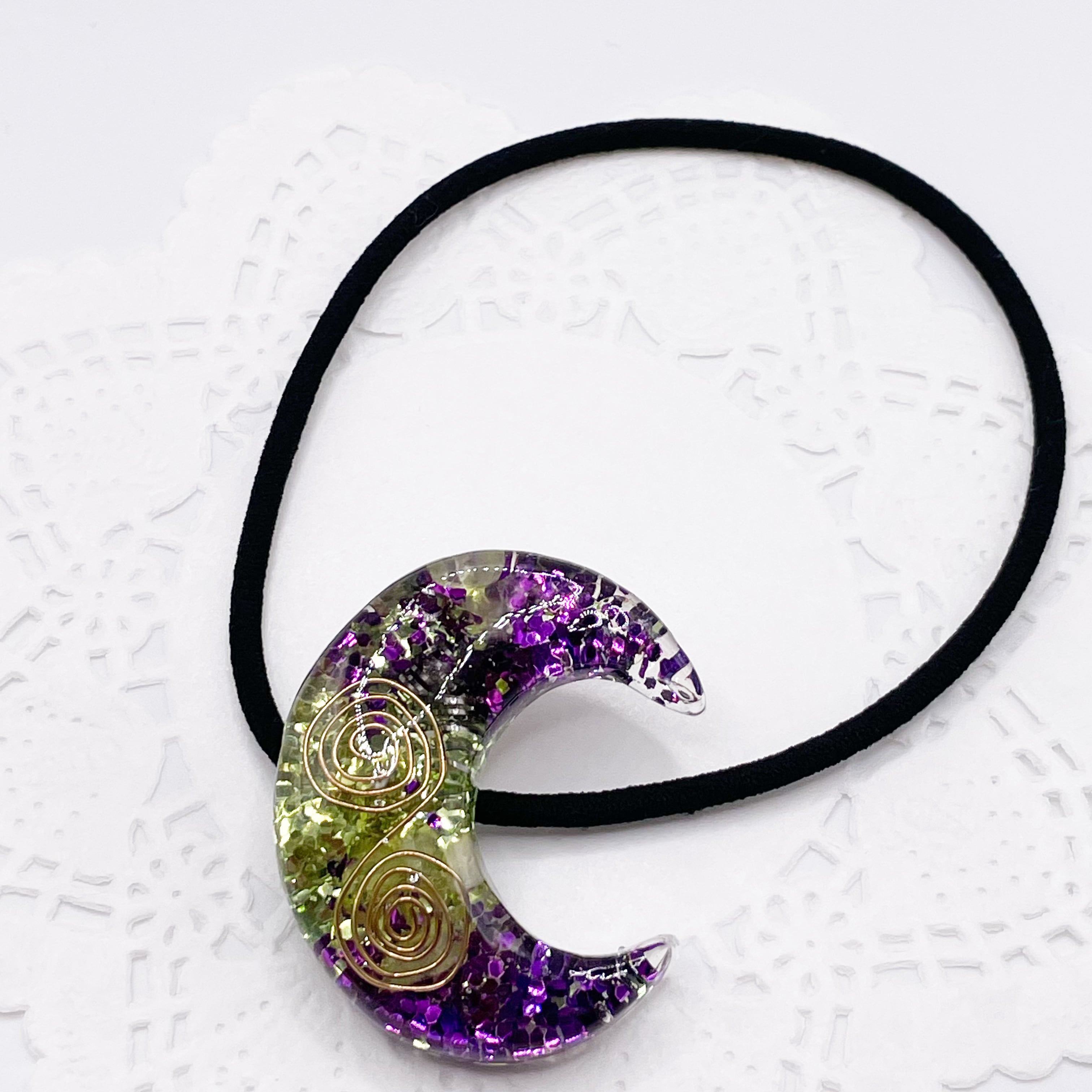 月のオルゴナイトの天然石ヘアゴム/緑×紫・レモンクォーツ|g-014【One of a Kind Moon Hair Tie – Natural Stone Accessory】
