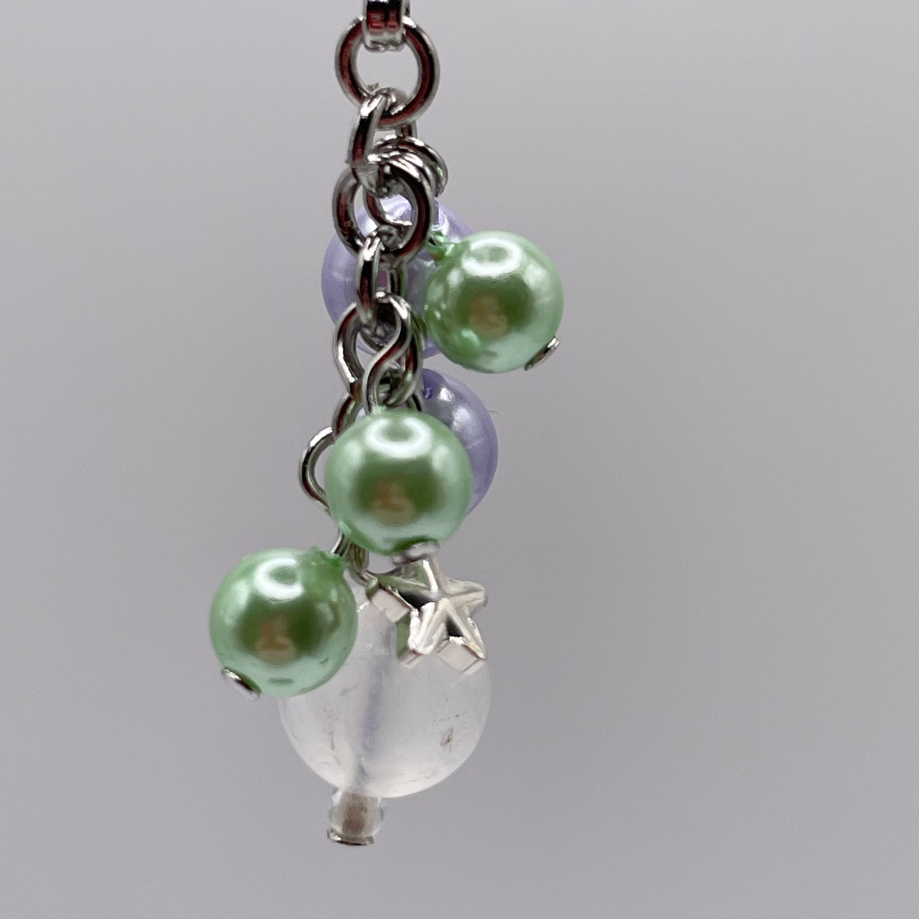 ムーンストーンに紫とグリーンの樹脂パールを合わせた天然石チャームです。