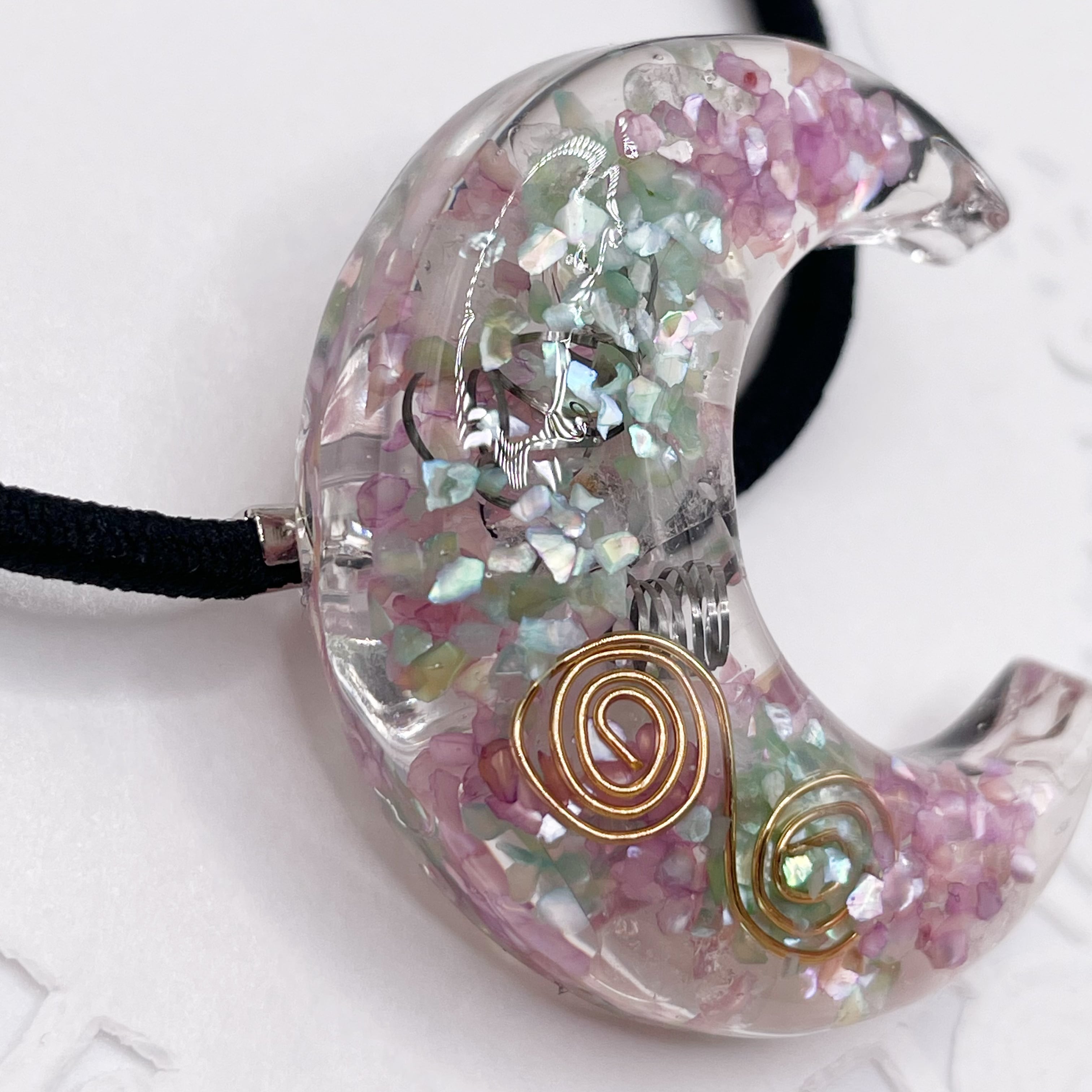 月のオルゴナイトの天然石ヘアゴム/ミントグリーン×パープル・水晶|g-019【One of a Kind Moon Hair Tie – Natural Stone Accessory】
