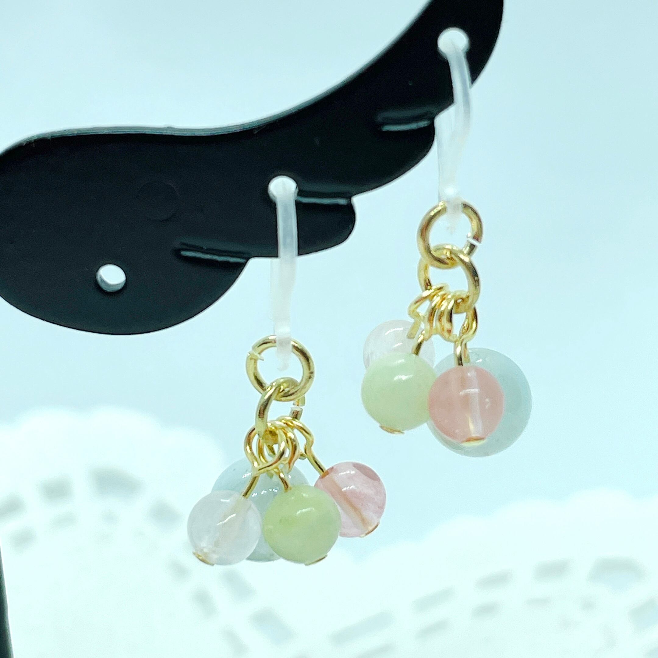 アクアマリン(6㎜)をメインに、4㎜のストロベリークォーツ、ミルクジェイド、ローズクォーツを合わせたピアスです。