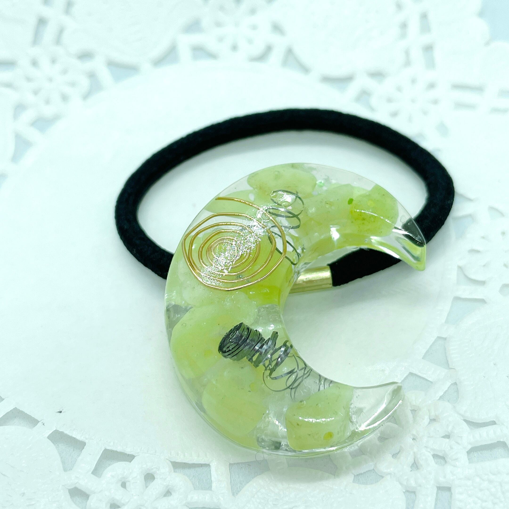 【Sold out】月のオルゴナイトのヘアゴム・オリーブジェイド|癒し・精神安定※アウトレット※or-015