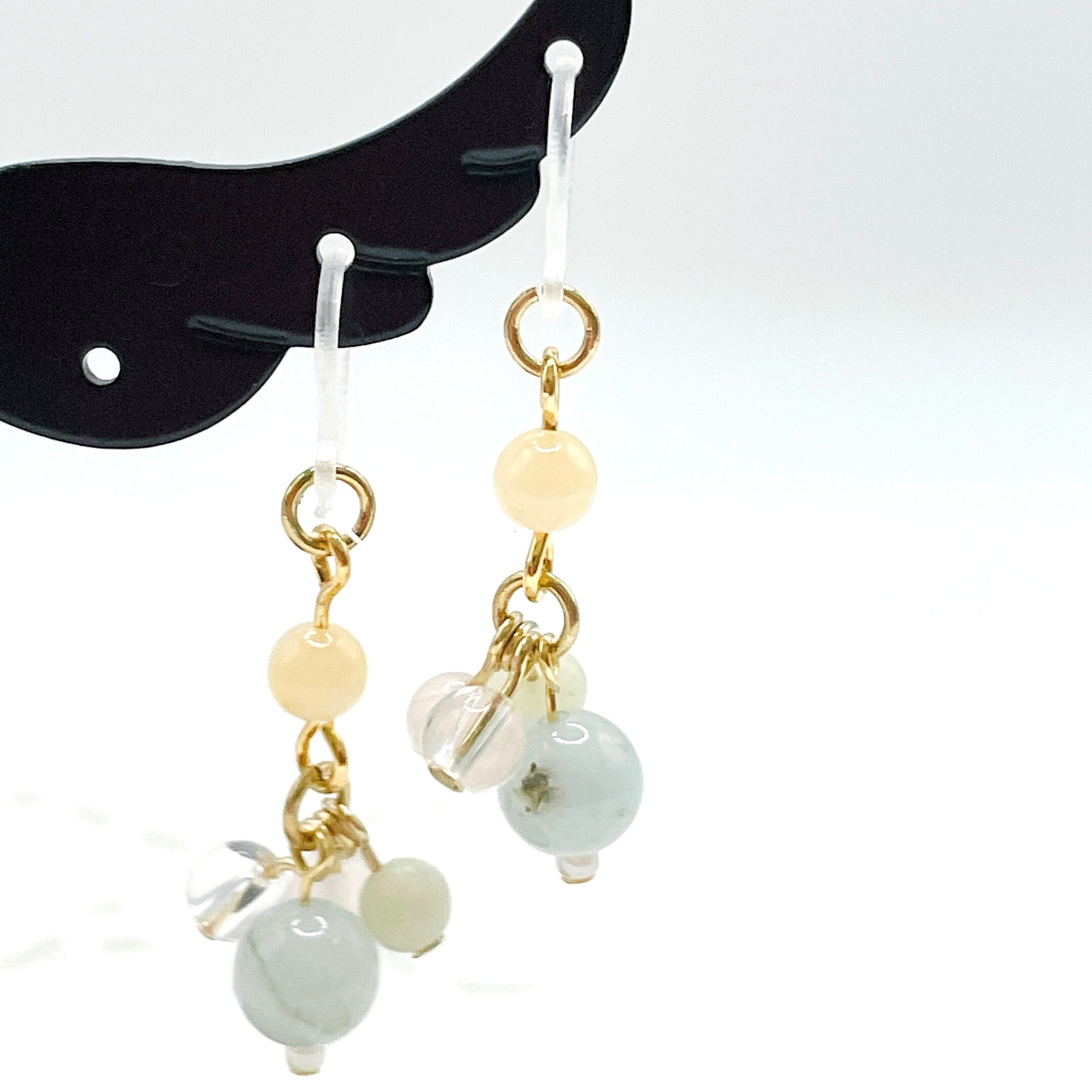アクアマリン(6㎜)をメインに、4㎜のトパーズ、ローズクォーツ、ミルクジェイド、クリスタルを合わたピアスです。