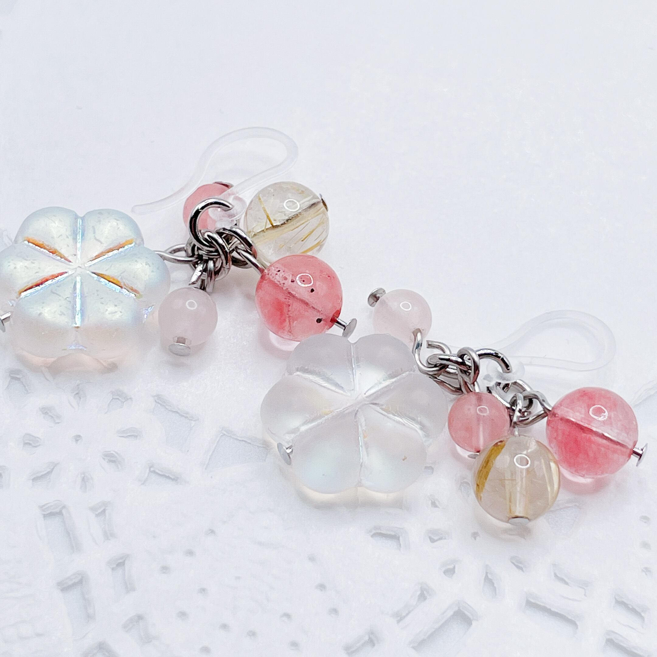 お花の形をしたガラスビーズをメインに、ルチルクォーツやピンク系の天然石を合わせた、乙女感満載な天然石ピアス(イヤリング/チャーム)です。