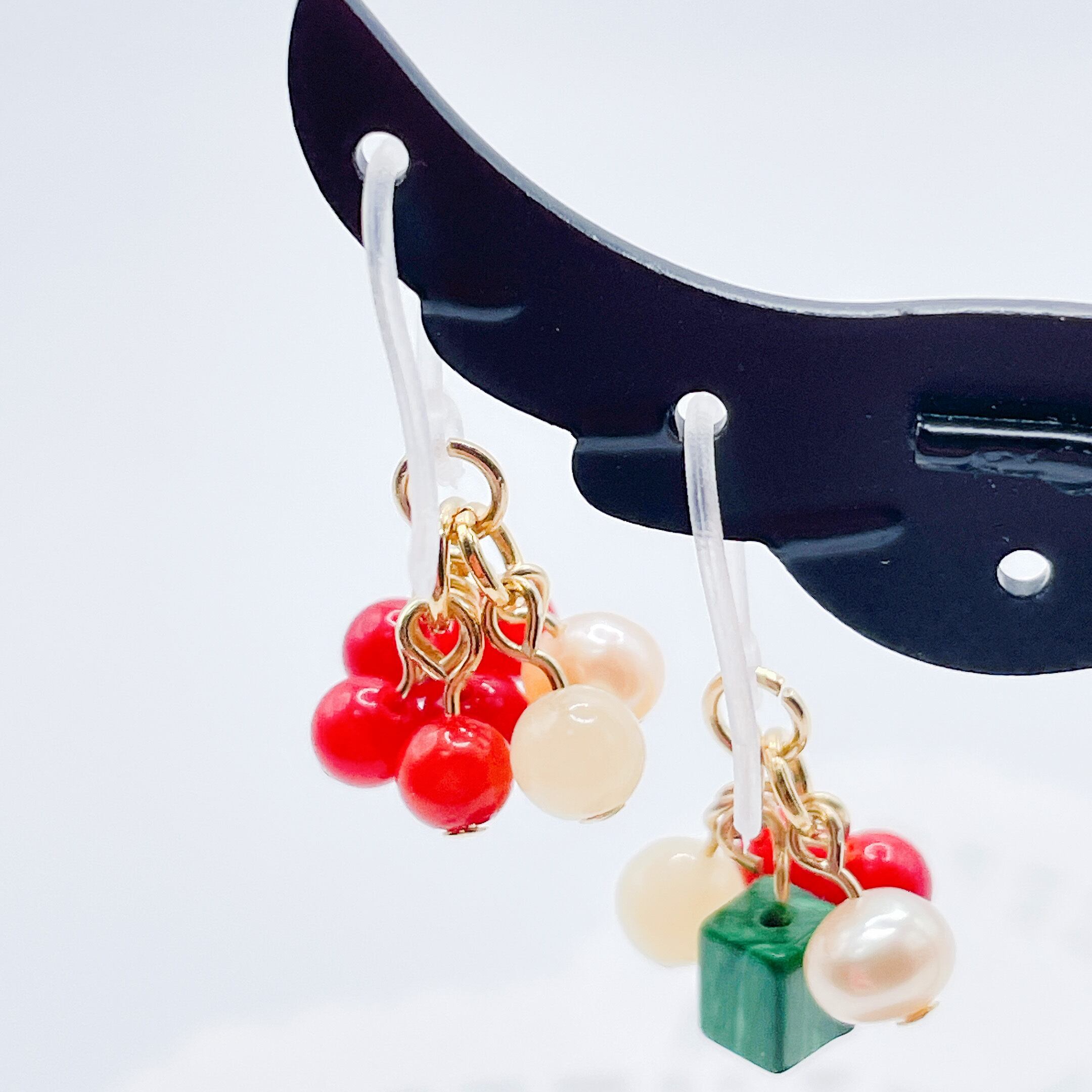 【Sold out】x-007 Happy Xmas007 真っ赤な珊瑚と深い緑のマラカイトのアシンメトリーなクリスマス ピアス/イヤリング