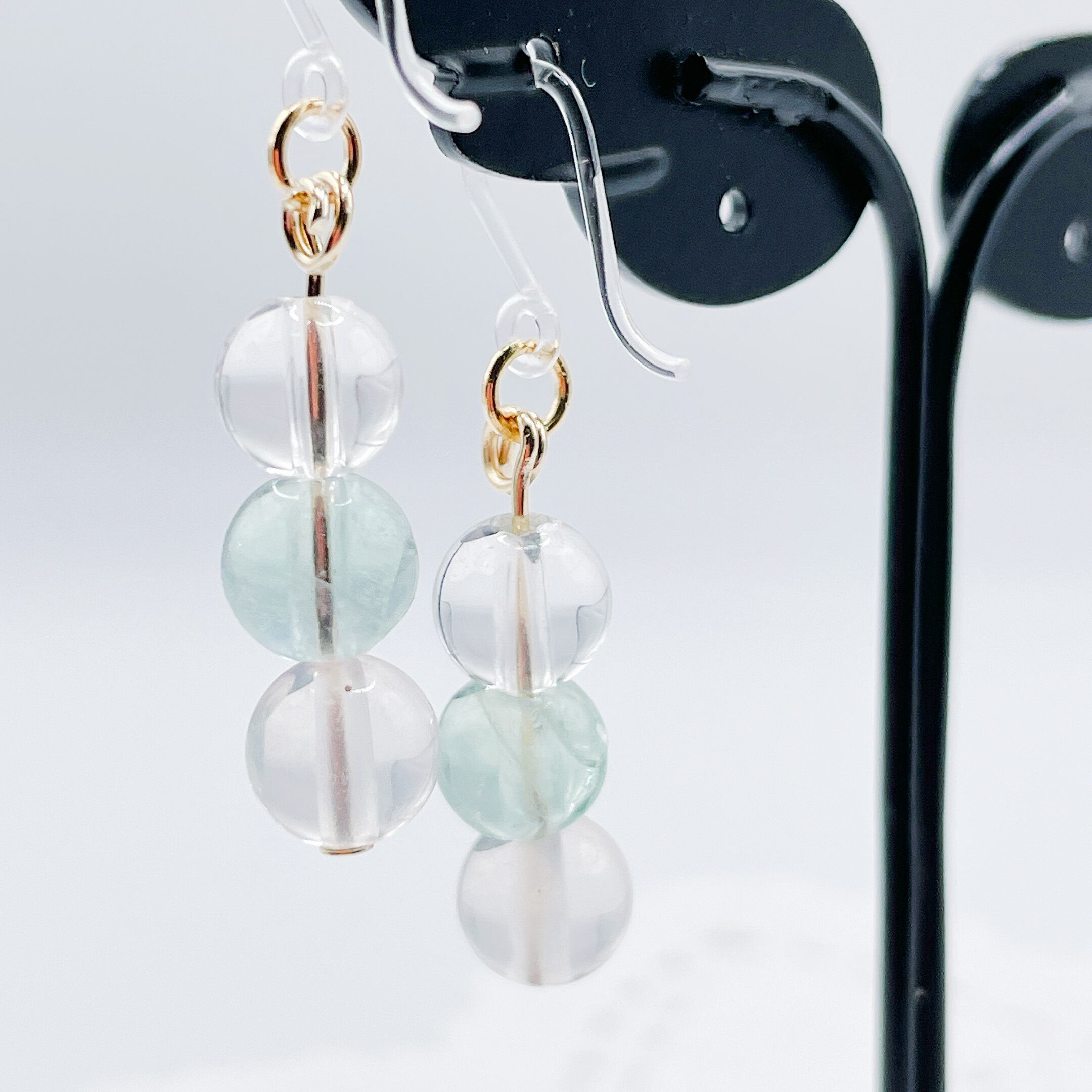 グリーン系のフローライトにローズクォーツ、クリスタル(水晶)を合わせた、お団子のような可愛らしいデザインのピアスです。