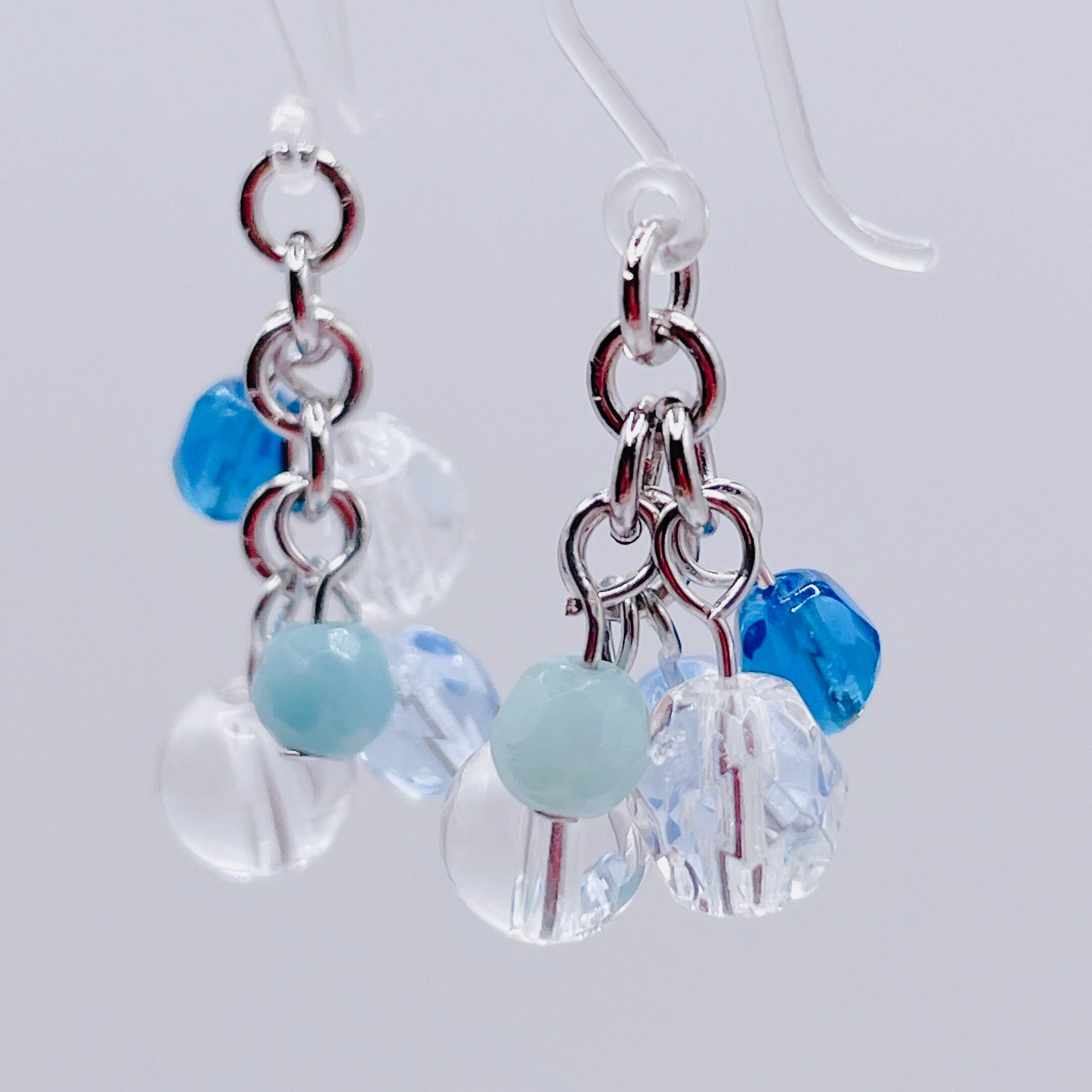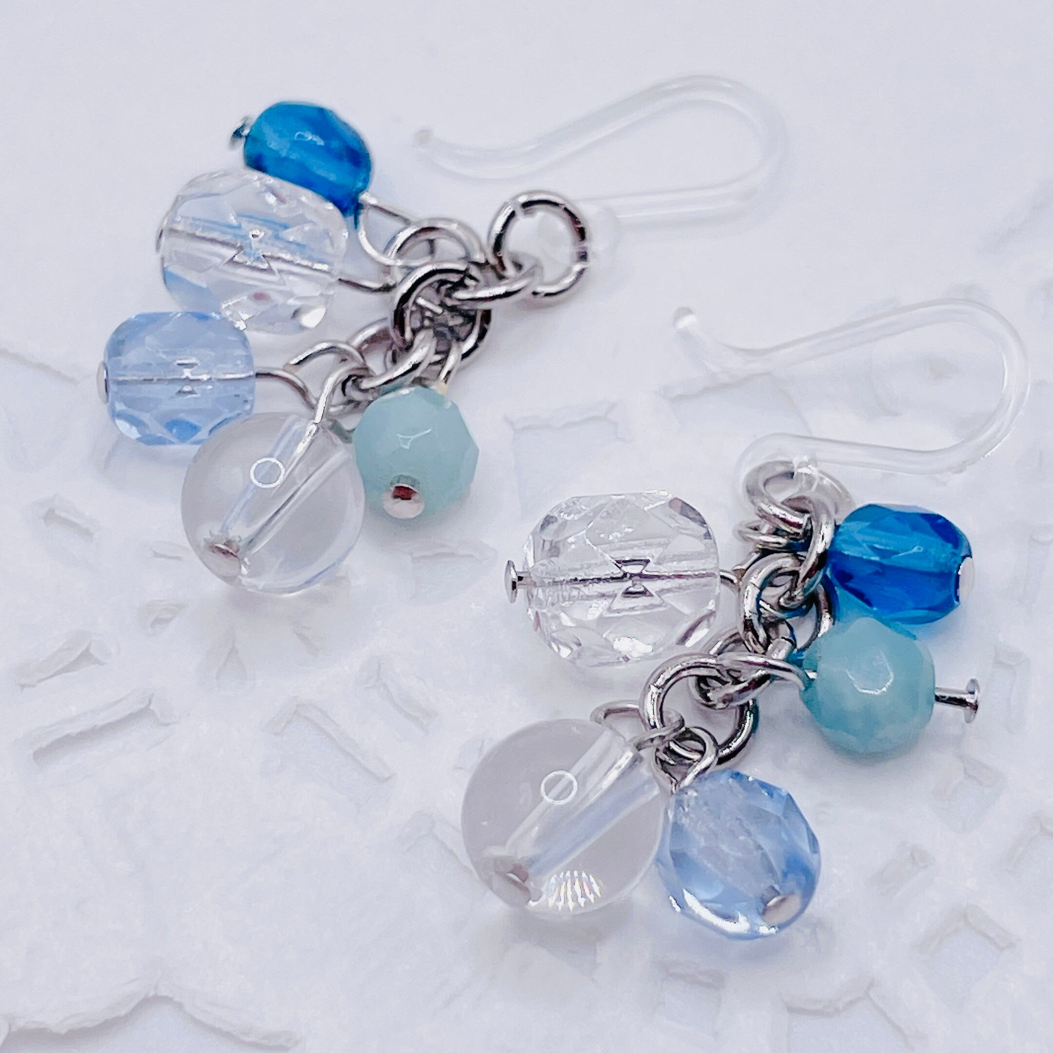 アマゾナイトとクリスタルといった天然石とチェコビーズを使用し、澄んだ青空のような透明感のあるピアスに仕上げました。